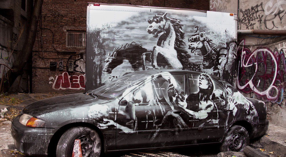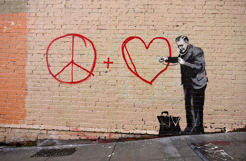 Whether the street works seem utopian or anarchic, aggressive or sympathetic, stunningly well-executed or juvenile, original or derivative, most street artists seriously working in the genre begin with a deep identification and empathy with the city: they are compelled to state something in and with the city, whether as forms of protest, critique, irony, humor, beauty, subversion, clever prank or all of the above. The pieces can be ephemeral, gratuitous acts of beauty or forms of counter-iconography, inhabiting spaces of abandonment and decay, or signal jams in a zone of hyper-commercial messaging.
