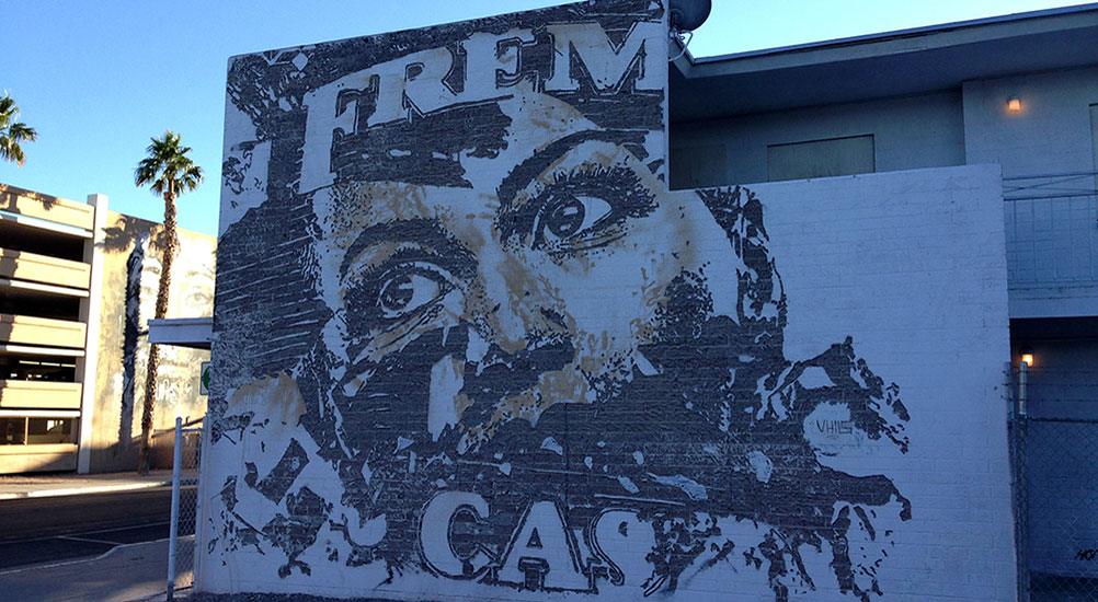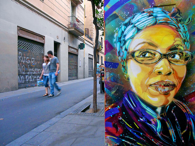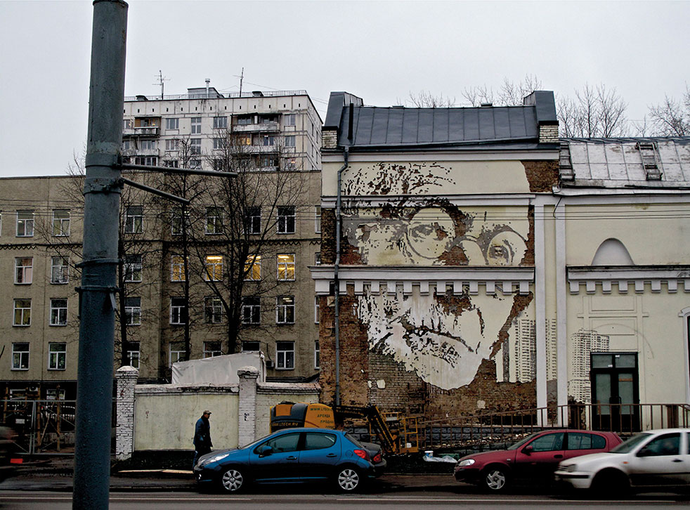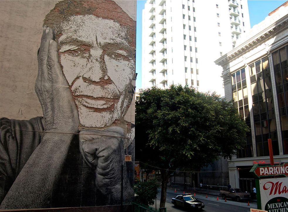 Believes that everyone is made up of different layers of historial and social fabric, and he seeks to portray this idea in the street art he creates. He uses a variety of different tools, like chisels, acids, bleach, and drills, in order to remove the layers of the surface he is working on. His work normally uses three different colros to help provide for depth, and results in turning normal individual into icons.