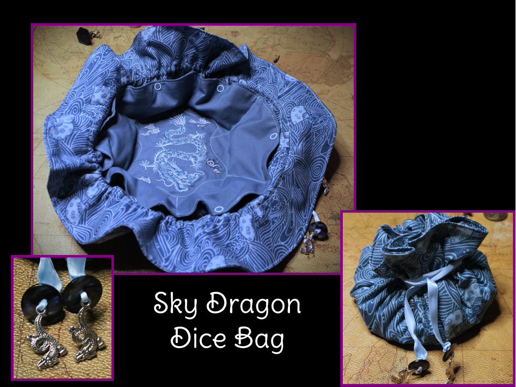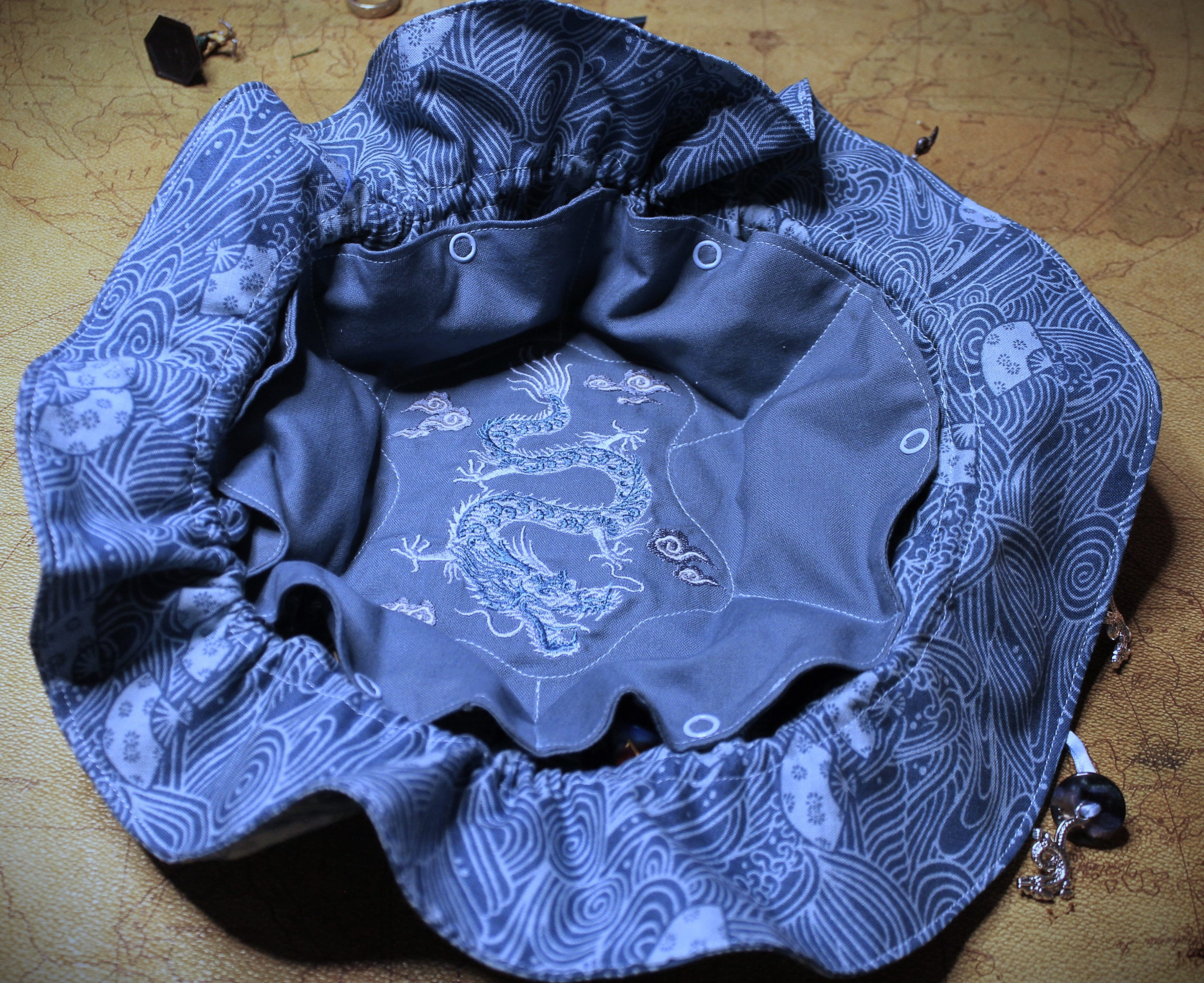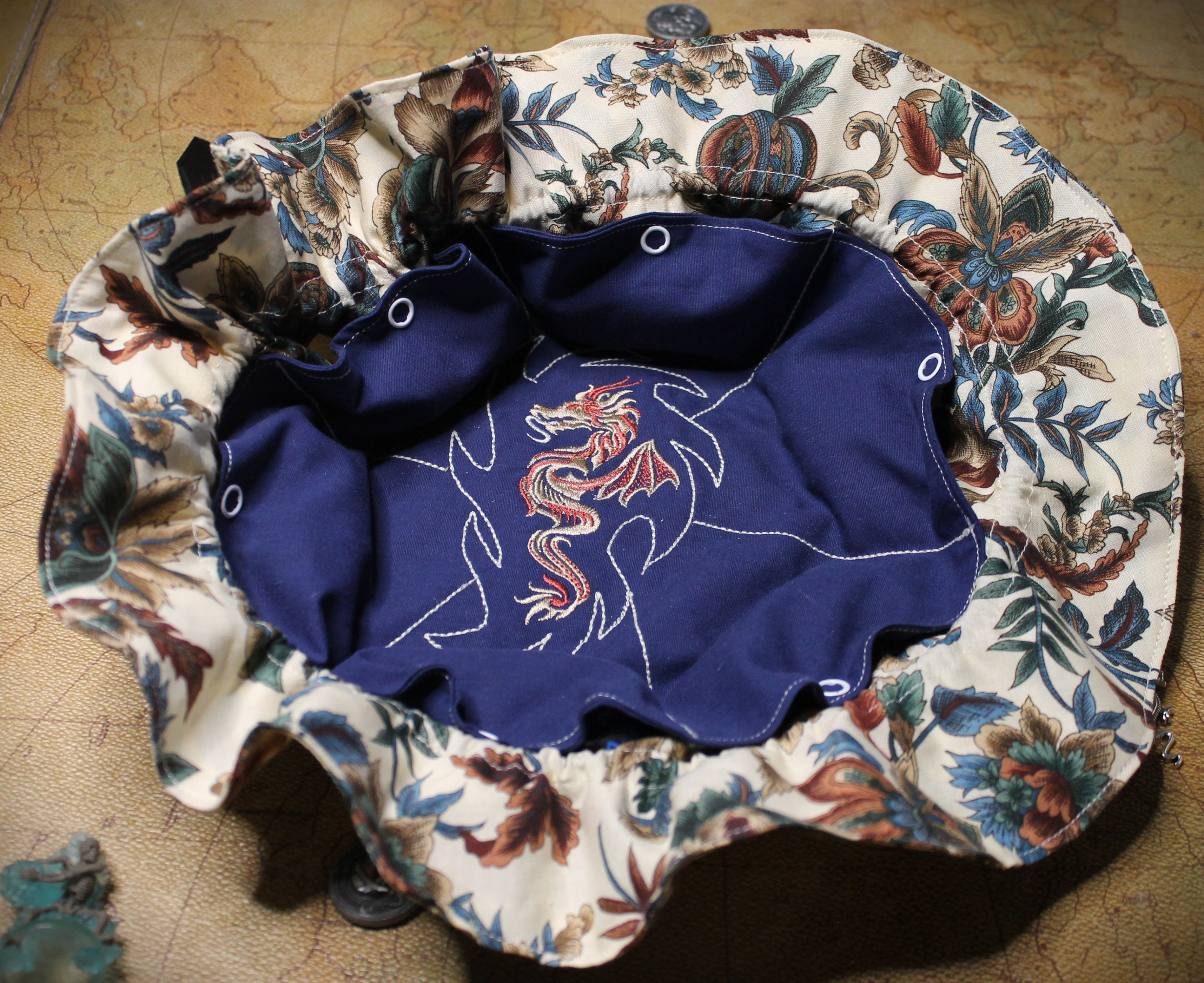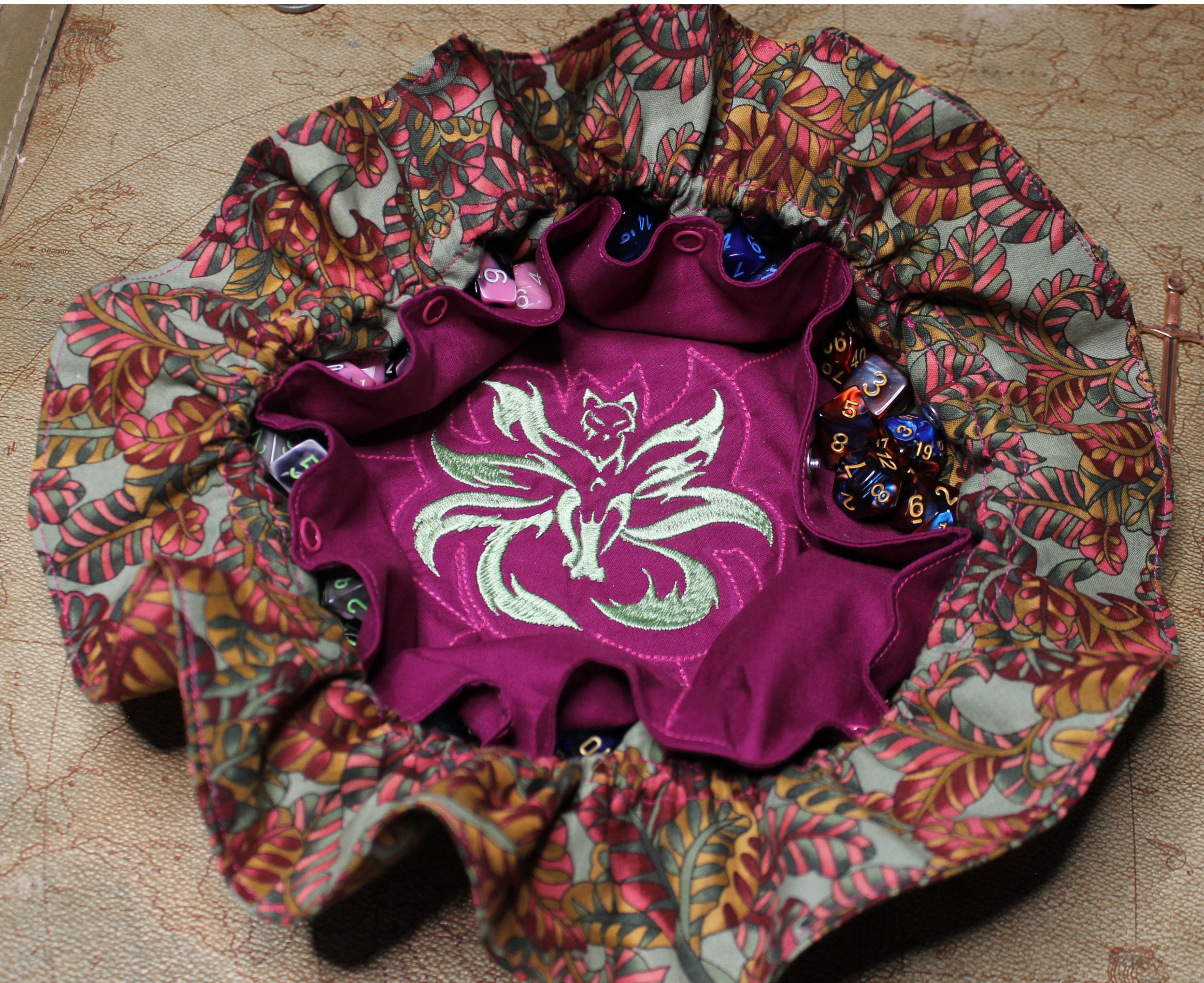 These dice bags are my favorite item to make. The fabric, color scheme, tassets and embroidery pattern are all considered in the design process to come up with a cohesive one of a kind dice bag that the customer will love. Bags hold up to 6 sets of polyhedral dice. Who says Dungeons and Dragons only needs to use dragons as the main design for a bag? I believe in giving customers more options to find that perfect bag to meet their unique aesthetic. Not seeing something you like? I also take custom orders, with a wide variety of different fabric, color, tasset, and embroidery patterns to choose from. Feel free to click the link below or visit the orders page to message me, and we can make your perfect dice bag a reality!