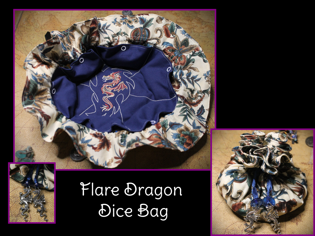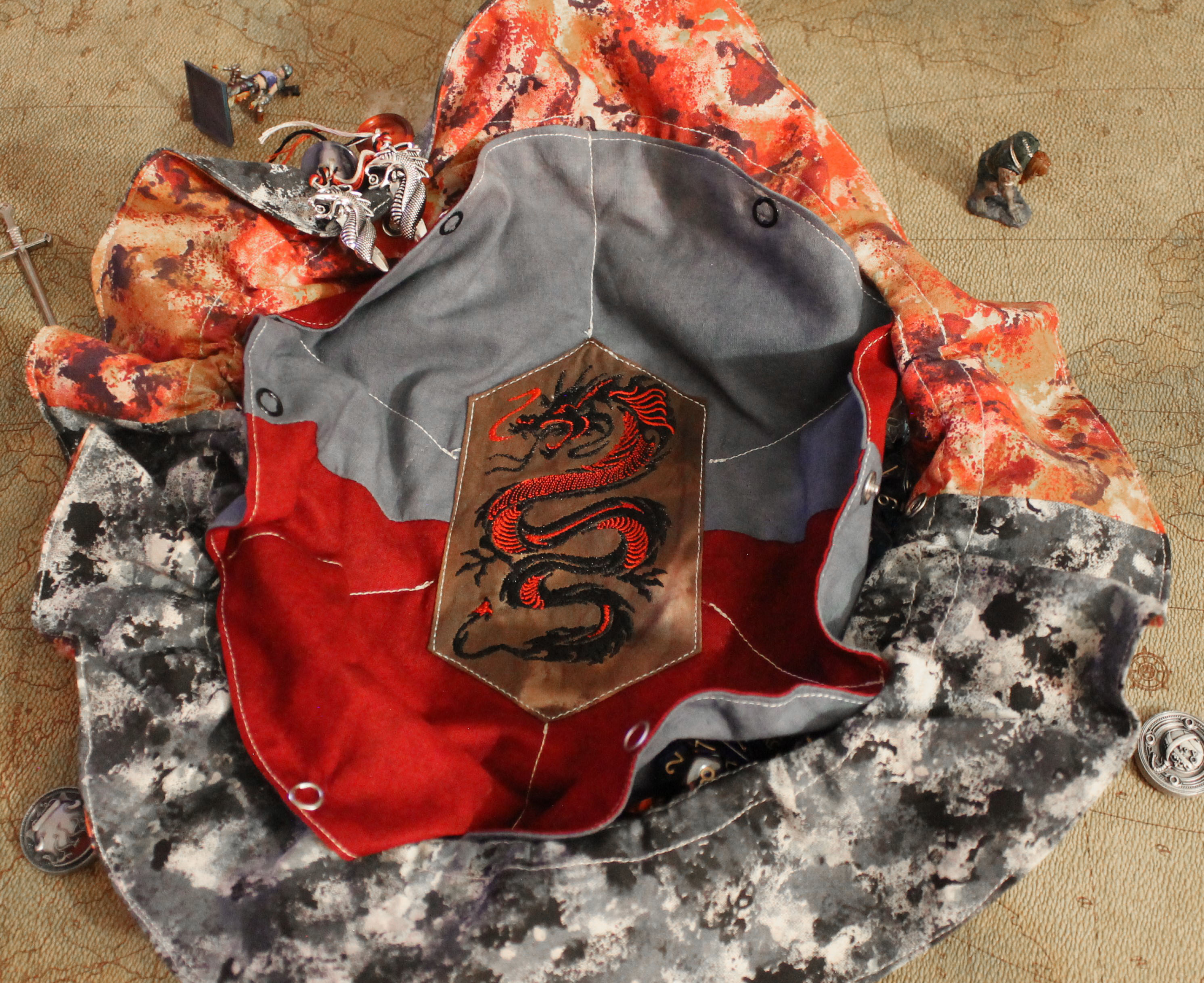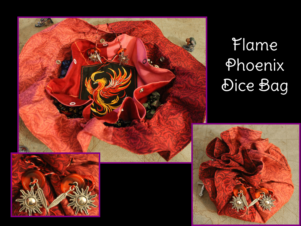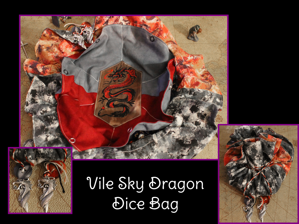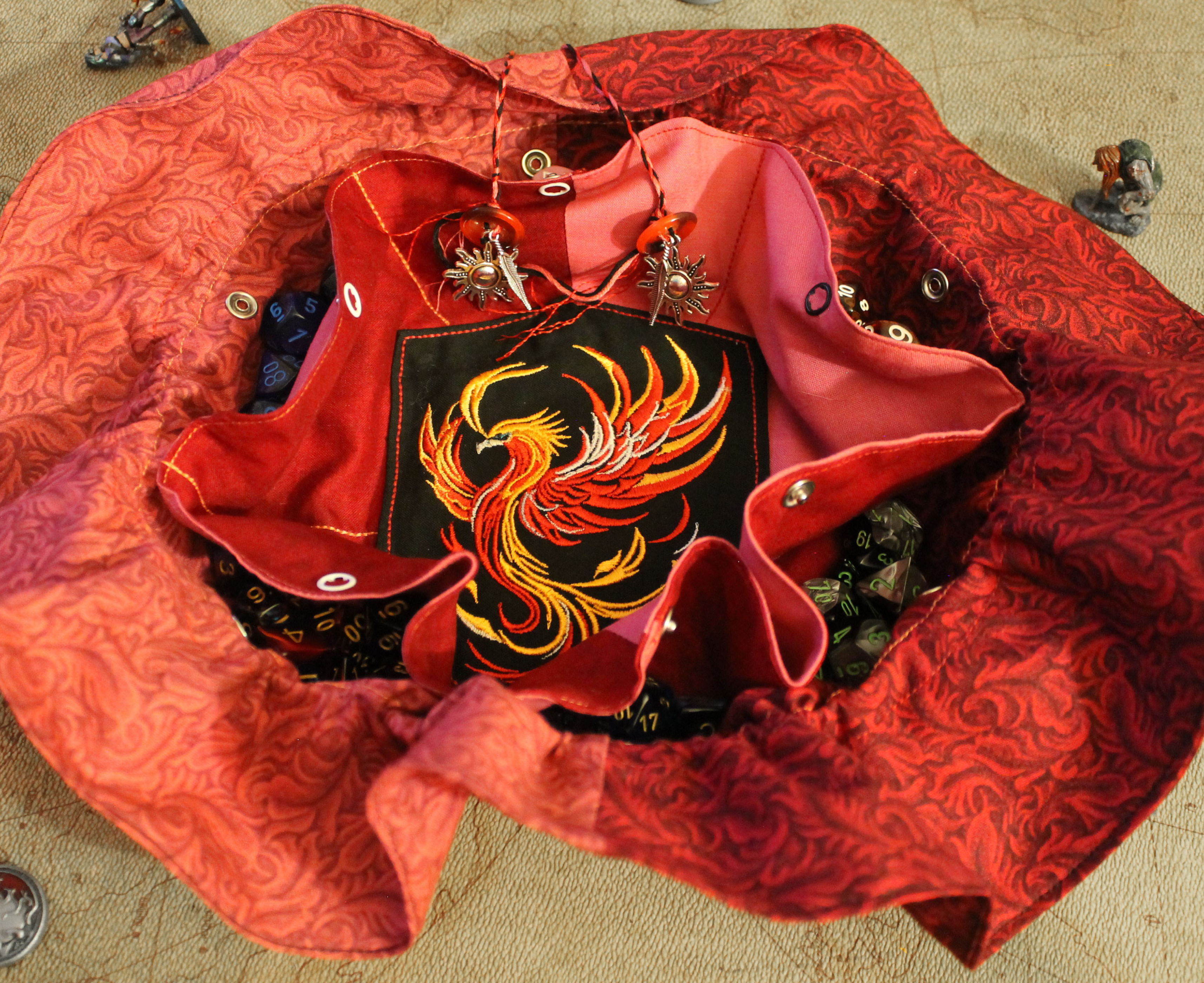 These dice bags are my favorite item to make. The fabric, color scheme, tassets and embroidery pattern are all considered in the design process to come up with a cohesive one of a kind dice bag that the customer will love. Bags hold up to 6 sets of polyhedral dice. Who says Dungeons and Dragons only needs to use dragons as the main design for a bag? I believe in giving customers more options to find that perfect bag to meet their unique aesthetic. Not seeing something you like? I also take custom orders, with a wide variety of different fabric, color, tasset, and embroidery patterns to choose from. Feel free to click the link below or visit the orders page to message me, and we can make your perfect dice bag a reality!